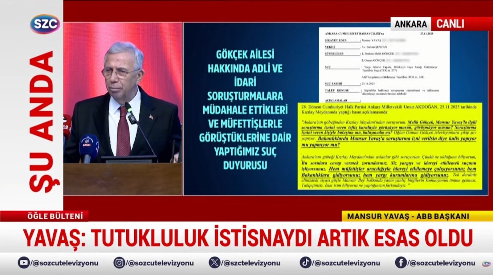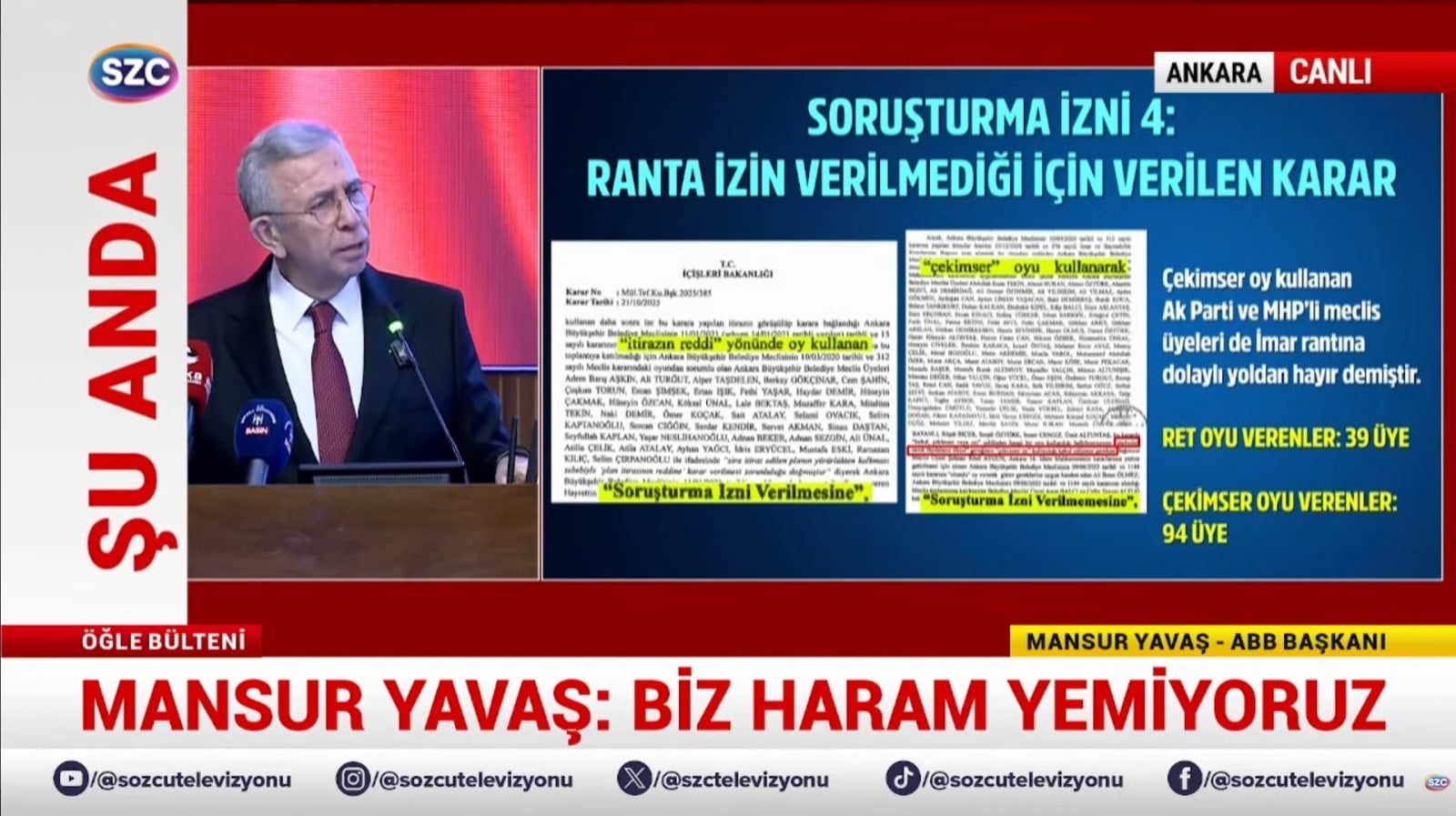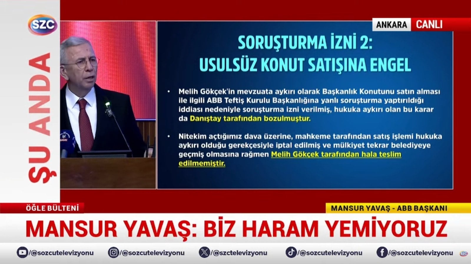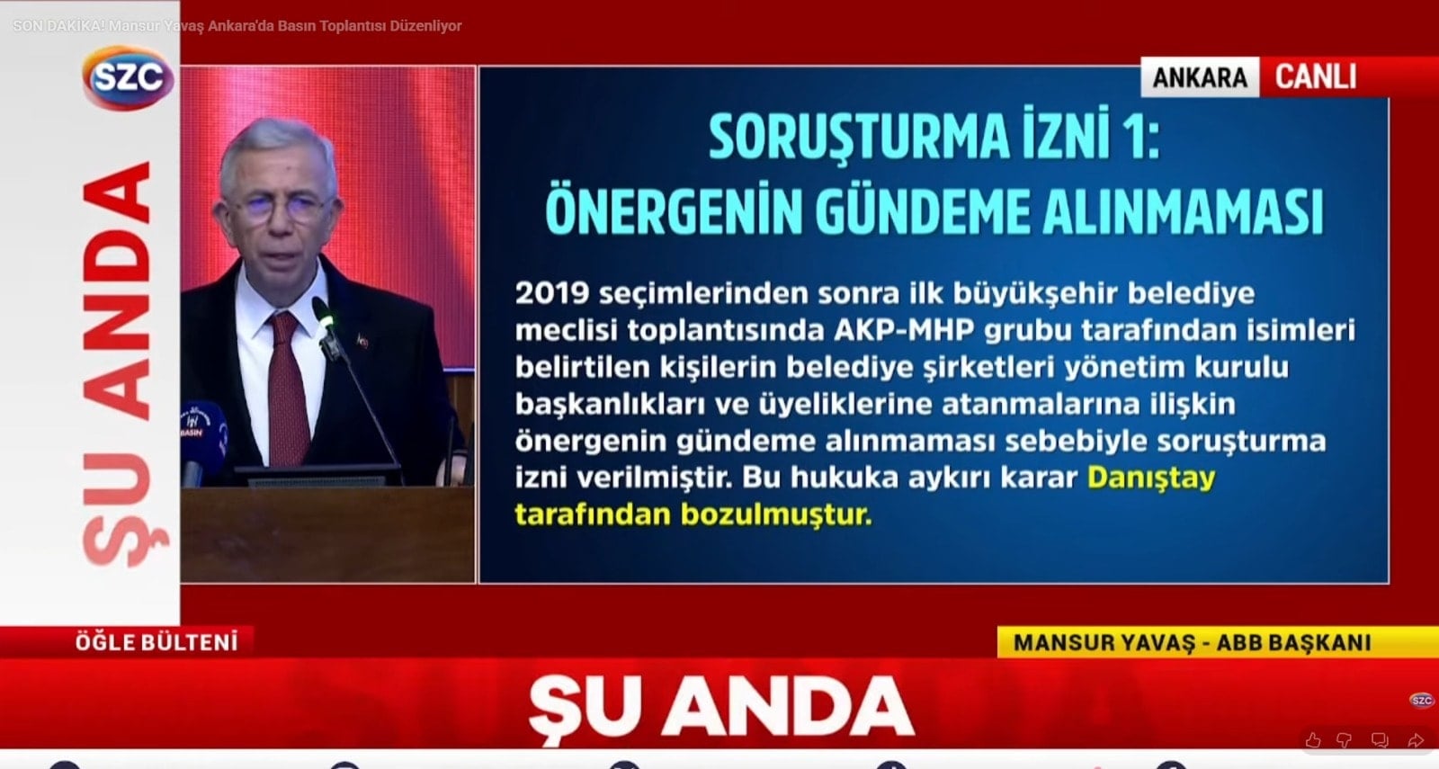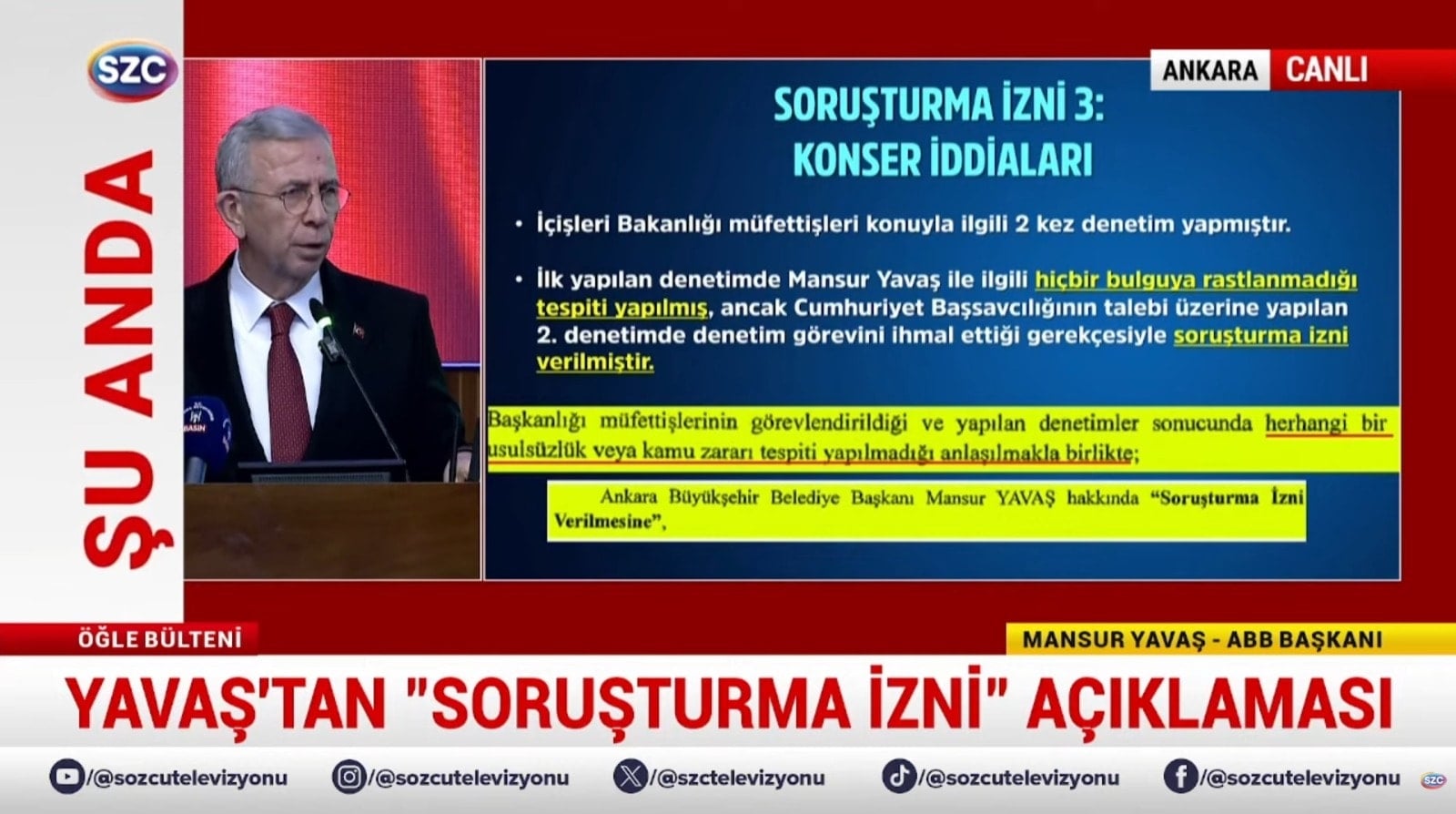 Evet, devam edelim. 3. Soruşturmaya geliyoruz. Konser iddiaları. Konser iddiaları ile ilgili buraya müfettiş geldi. İnceledi, raporunu verdi. Raporunda Mansur Yavaş'la ilgili hiçbir şey yok. Tekrar savcının talebi üzerine bir daha geldi. Bakın onda da ne diyor? Müfettişleri görevlendirildi. Yapılan denetimler sonucunda herhangi bir usulsüzlük veya kamu zararı tespit edilmediği zararı tespiti yapılmadığı anlaşılmakla birlikte Ankara Büyükşehir Belediye Başkanı Mansur Yavaş hakkında soruşturma izni verilmesine. Yani madem bir şey yok ne soruşturması veriyorsunuz? Dolayısıyla biz bu karara da itiraz ettik. Çünkü özellikle Danıştay 1. Dairesinde Gökçek dönemine ait, Gökçek'le yapılan Ankara Belediyesi'ndeki bütün ihalelerle ilgili yapılan şikayetlerle ilgili tamamında Melih Gökçek'in aktif olarak bu ihalelere katılmadığı gerekçesiyle tamamında soruşturma izninin verilmemesi kararını vermişlerdi. Oysa daha önceki basın toplantısında gösterdim.