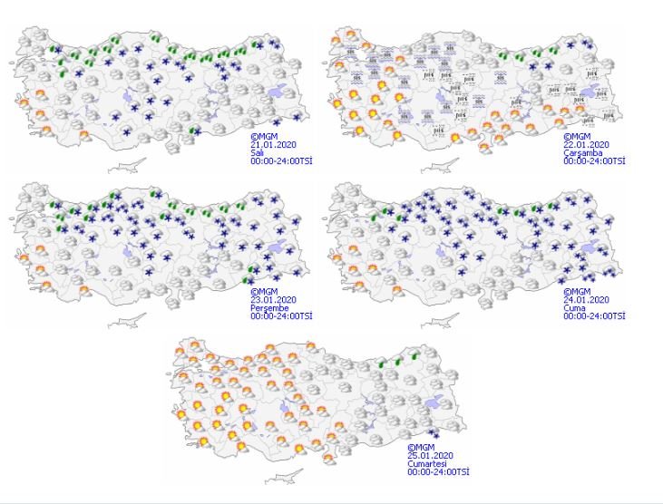 Meteoroloji Genel Müdürlüğünden alınan tahminlere göre, hava sıcaklığında önemli bir değişiklik olmayacağı, mevsim normalleri civarında seyredeceği tahmin ediliyor. Rüzgarın ise genellikle kuzeyli yönlerden hafif, ara sıra orta kuvvette, Akdeniz’in iç kesimleri ile Malatya ve Adıyaman çevrelerinde kuvvetli ve yer yer fırtına şeklinde esmesi bekleniyor.