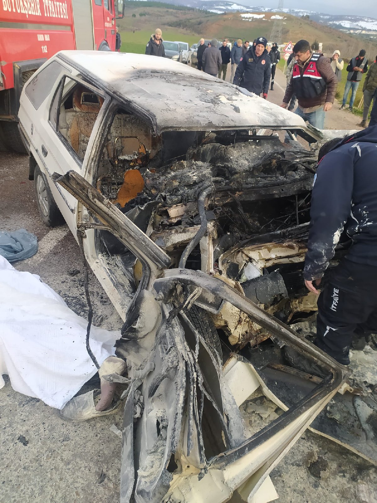 Kazayla birlikte hurdaya dönen araçlardan otomobil alev aldı. İhbar üzerine bölgeye sevk edilen itfaiye ekipleri, alevlere müdahale ederek yangını söndürdü.