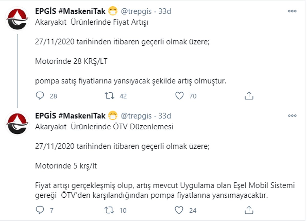 *27/11/2020 tarihinden itibaren geçerli olmak üzere; Motorinde 28 KRŞ/LT pompa satış fiyatlarına yansıyacak şekilde artış olmuştur.