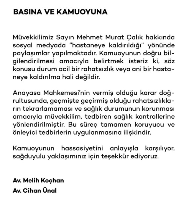 Çalık'ın avukatı ise 'Acil bir rahatsızlık veya ani bir hastaneye kaldırılma durumu yok. Tedbiren sağlık kontrollerine yönlendirilmiştir.' şeklinde açıklama yaptı.