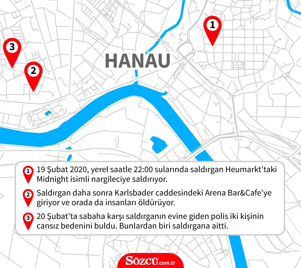 Kimliği henüz tespit edilemeyen saldırgan, Türk nüfusun yoğun olarak yaşadığı Hanau kasabasındaki "Midnight" adlı bir nargile kafeyi taradı ve burada üç kişiyi öldürdü.