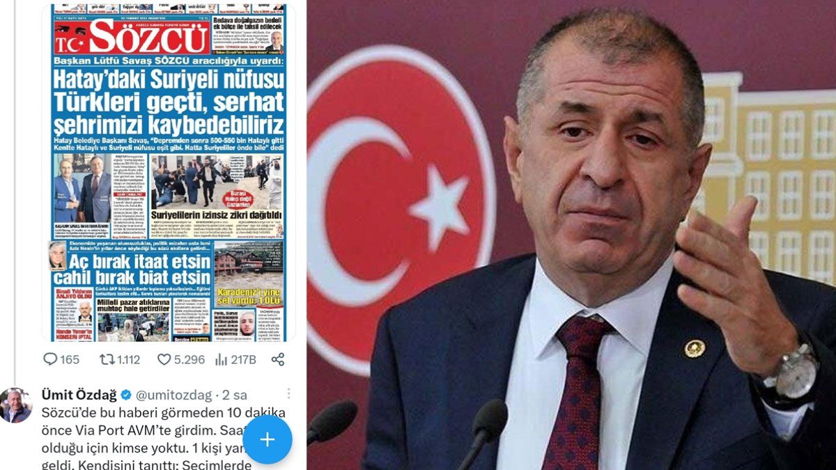 Zafer Partisi Genel Başkanı Ümit Özdağ, SÖZCÜ'nün Hatay'daki Suriyeli nüfusuna dikkat çeken manşetini paylaşarak, çok konuşulacak bir iddia ortaya attı. Özdağ, bugün gittiği bir AVM’de, bir kişinin yanına gelerek, 'seçimlerde, Bursa’dan Hatay’a 500 otobüs ile vatandaşlık alan Suriyelileri oy kullanmak için taşıdıklarını' söylediğini belirtti.