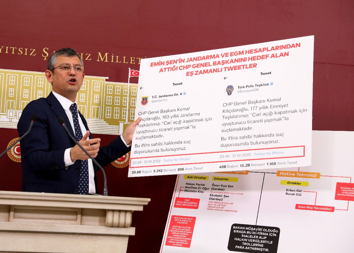 Emin Şen'in ortağı olan Erkan Gül'ün firması Asist Bilgi Teknolojilerinin 2018-2020 yılları arasında 418 bin dolarlık ihale aldığını ve adreslerinin Native ile aynı olduğunu belirten Özgür Özel şöyle devam etti: