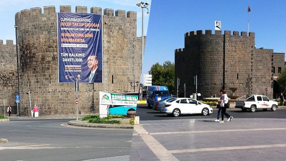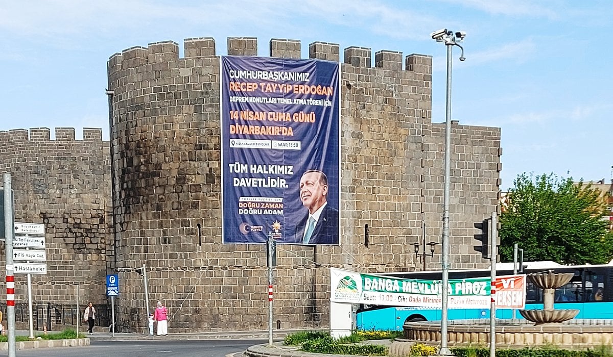 Yerine Cami açılışı için kente gelen Erdoğan’ın surları boydan boya çevreleyen bez afişleri asıldı. Cami'nin açılışının üzerinden 25 gün geçmesine rağmen Erdoğan’ın afişleri ise yaklaşan seçim öncesi sökülmedi.