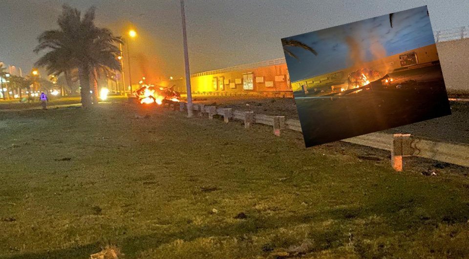 FOTO: Reuters/ Bağdat Uluslararası Havalimanı yakınlarına yönelik füze saldırısının ardından yolda yanan bir enkaz görülüyor.'ŞAM'DAN GELİYORDU' İDDİASI