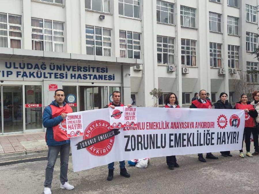 DİSK'e bağlı Dev Sağlık İş Bursa Şubesi, Uludağ Üniversitesi Tıp Fakültesi önünde pankart açarak, 'Zorunlu emeklilik' düzenlemesini protesto etti.