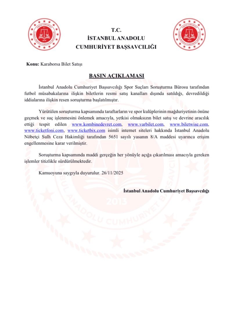 "İstanbul Anadolu Cumhuriyet Başsavcılığı Spor Suçları Soruşturma Bürosu tarafından futbol müsabakalarına ilişkin biletlerin resmi satış kanalları dışında satıldığı, devredildiği iddialarına ilişkin resen soruşturma başlatılmıştır.