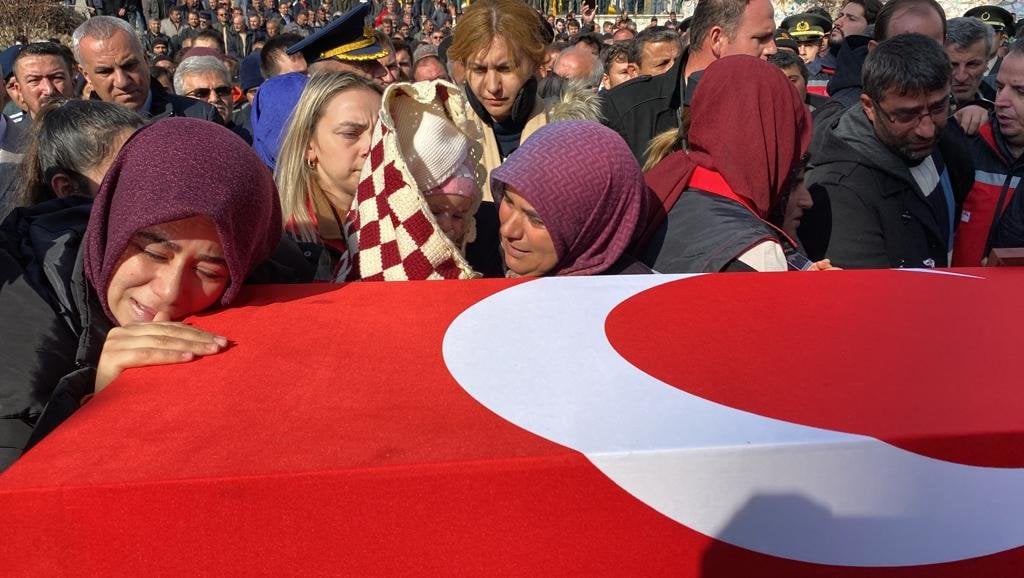4 aylık kızı Efnan'ı da eşinin tabutunun başına getiren Derya Işık, "Bak bir tanem, prensesin burada. Senin gibi güçlü kızım. Nasıl geldi yanına, bak dimdik. Melek gibiydi zaten. Bir kanatları yoktu. Kanatları da oldu, bak nasıl uçuyor" diye konuştu. Şehit Işık'ın cenazesi, namazın ardından mahalle mezarlığına defnedildi. (DHA)