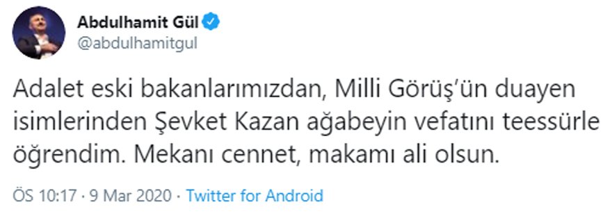 Twitter hesabından paylaşım yapan Gül, "Adalet eski bakanlarımızdan, Milli Görüş'ün duayen isimlerinden Şevket Kazan ağabeyin vefatını teessürle öğrendim. Mekanı cennet, makamı ali olsun" ifadelerini kullandı.