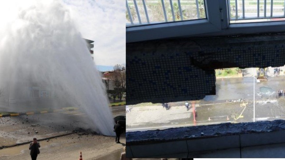 Trabzon'da Devlet Sahil Yolu'nu göle döndüren, 8 katlı binanın çatı katında hasara neden olan ana isale hattının patlama anına ilişkin güvenlik kamerası görüntüleri ortaya çıktı. Görüntülerde; patlama ile yarılan asfalttan fışkıran suyun saniyeler içinde metrelerce yükseğe ulaştığı görüldü.