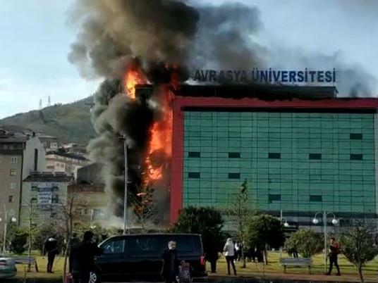 DHAYomra Belediye Başkanı İbrahim Sağıroğlu, yaptığı açıklamada, Avrasya Üniversitesinin Yomra yerleşkesinde bulunan idari bölümlerin ve dersliklerin de bulunduğu 8 katlı binanın mutfak bölümünde yangın çıktığını söyledi.Yangının hızla büyüdüğünü belirten Sağıroğlu, "Yangın binanın yanmaya müsait dış kaplaması dolayısıyla hızla dış cepheden yayıldı. Binanın üçte biri zarar gördü ve çatıya kadar ulaşan yangın, itfaiye ekiplerinin müdahalesiyle kontrol altına alındı. Ekiplerimiz soğutma çalışmalarına devam ediyor." dedi.