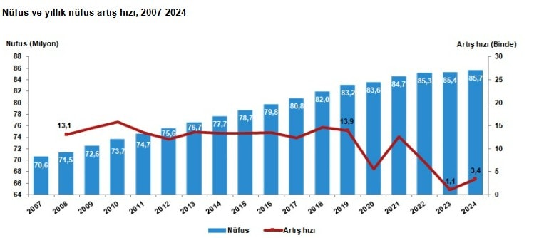 Yıllık nüfus artış hızı 2023 yılında binde 1,1 iken, 2024 yılında binde 3,4 oldu.