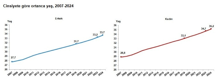 Türkiye'de 2023 yılında 34 olan ortanca yaş, 2024 yılında 34,4'e yükseldi. Cinsiyete göre incelendiğinde, ortanca yaşın erkeklerde 33,2'den 33,7'ye, kadınlarda ise 34,7'den 35,2'ye yükseldiği görüldü.