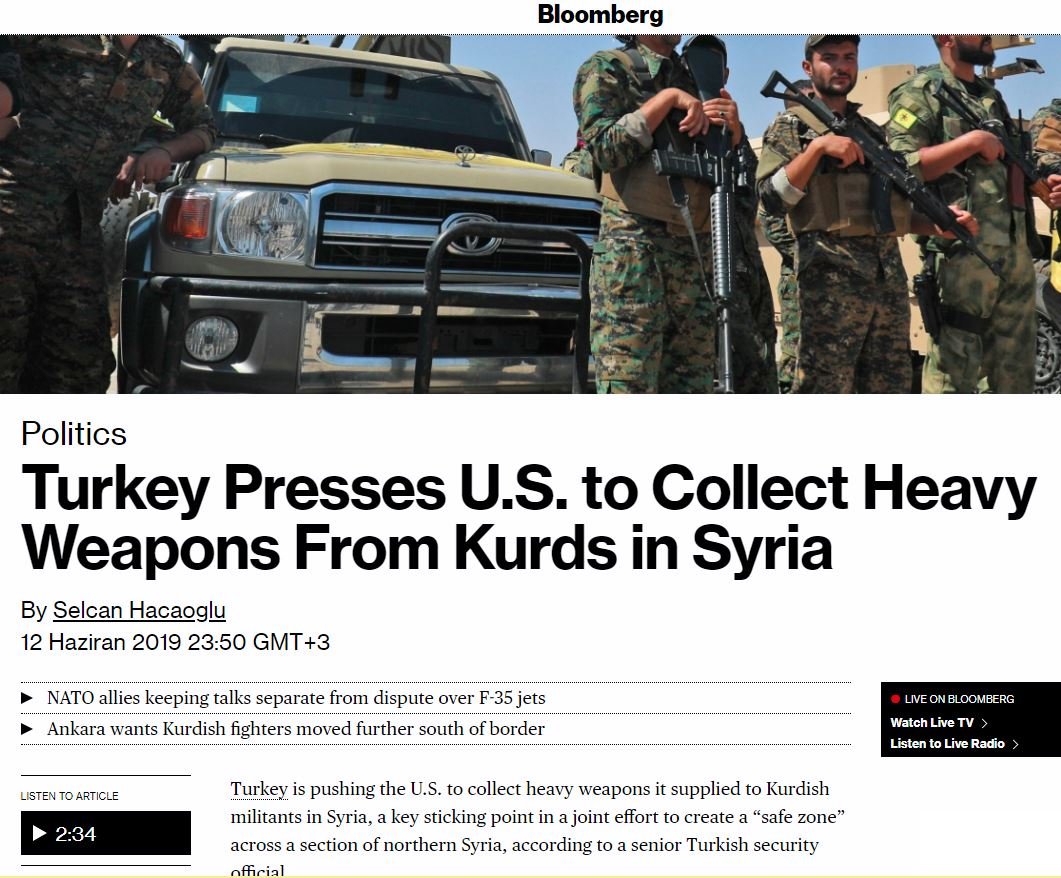 Selcan Hacaoglu imzalı haberde, "Türkiye, Suriye'deki Kürtlerden ağır silahları almak için ABD'ye baskı yapıyor" başlığını kullanırken, ABD ile Türkiye'nin F-35 krizinden bağımsız olarak bu konuyu görüştüğü belirtildi.