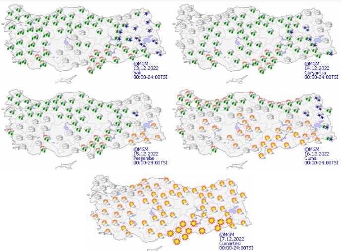 Yapılan en son değerlendirmelere göre: Ülkemiz genelinin parçalı ve çok bulutlu, Marmara'nın güney ve doğusu, Ege, Akdeniz, İç Anadolu'nun kuzey ve batısı, Karadeniz( Artvin hariç), Doğu Anadolu'nun güney ve batısı, Güneydoğu Anadolu(Gaziantep ve Kilis hariç) ile Erzurum ve Ağrı çevrelerinin yağışlı geçeceği tahmin ediliyor.