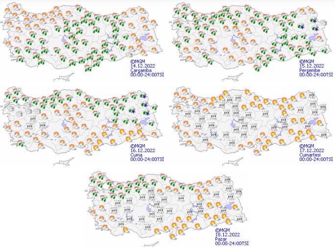Genellikle yağmur ve sağanak, Batı Karadeniz'in iç kesimleri, Tunceli, Bingöl, Muş, Bitlis, Şırnak ve Hakkari'nin yükseklerinde karla karışık yağmur ve kar şeklinde olması beklenen yağışların Akdeniz bölge geneli, Samsun, Çorum, Amasya, Tunceli, Malatya, Gaziantep, Kilis, Adıyaman, Kırıkkale, Kırşehir, Yozgat, Sivas, Karaman, Konya'nın kuzey ve batısı ile Ankara'nın güney ve doğu çevrelerinde yer yer kuvvetli olması bekleniyor.