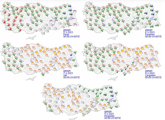 Ülkemiz genelinin parçalı ve çok bulutlu, Marmara, Ege, Batı Akdeniz, İç Anadolu (Karaman dışında), Karadeniz, Doğu Anadolu’nun kuzeyi ile Bitlis, Muş, Şırnak ve Hakkari çevrelerinin yağışlı geçeceği tahmin ediliyor.