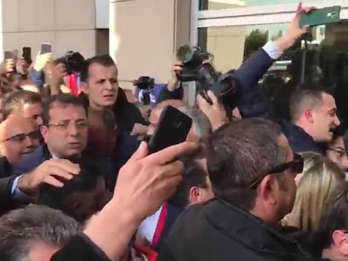 İmamoğlu, kalabalığın arasından geçtiği için izdiham yaşandı. Adalet Sarayı’na vatandaşlar tarafından kullanılan C kapısından giren İmamoğlu, burada partililer tarafından tezahürat ve alkışlarla karşılandı. O esnada adliyede bulunan bazı vatandaşlarda kalabalığın bulunduğu atrium açılan balkonlardan İmamoğlu’nu alkışladı. Burada da yaşanan yoğun izdiham nedeniyle İl Seçim Kurulu’nun bulunduğu kata merdivenlerle çıkarken güçlük yaşadı.