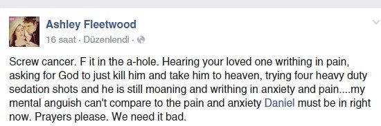 Ashley Fleetwood’un bundan 7 saat önce Facebook’ta paylaştığı not, okuyanları eşi Daniel’ın hastalığı yüzünden acı çektiğine şahit olduğunu düşündürdü. Sonunda, ‘Lütfen dua edin, buna ihtiyacımız var’ yazdığı notun üstünden çok vakit geçmemişti ki Daniel’ın vefat ettiğini duyurduğu ikinci bir not yayınladı Ashley Fleetwood.