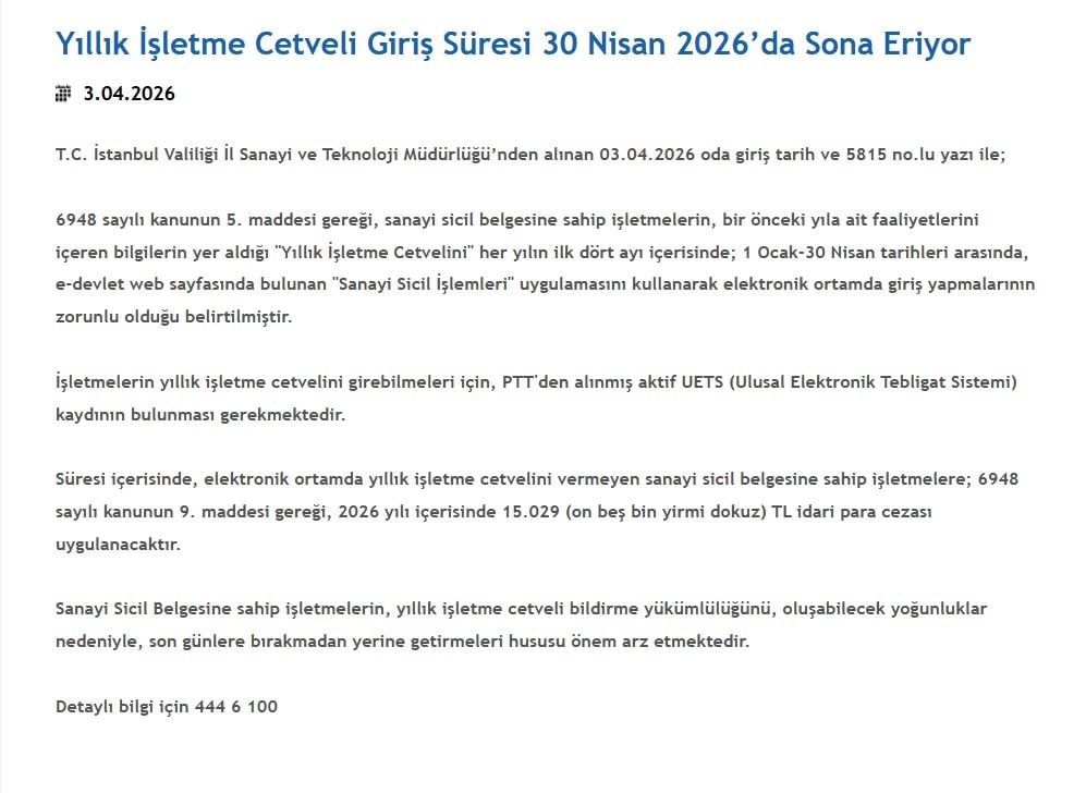 Açıklamada, 6948 sayılı Sanayi Sicil Kanunu’nun 5. maddesi gereğince, sanayi sicil belgesine sahip işletmelerin bir önceki yıla ait faaliyet bilgilerini içeren “Yıllık İşletme Cetveli”ni her yılın ilk dört ayında beyan etmelerinin zorunlu olduğu belirtildi. Buna göre işletmeler, 1 Ocak – 30 Nisan tarihleri arasında e-Devlet sistemi üzerinden “Sanayi Sicil İşlemleri” uygulamasını kullanarak bildirimlerini elektronik ortamda gerçekleştirecek.