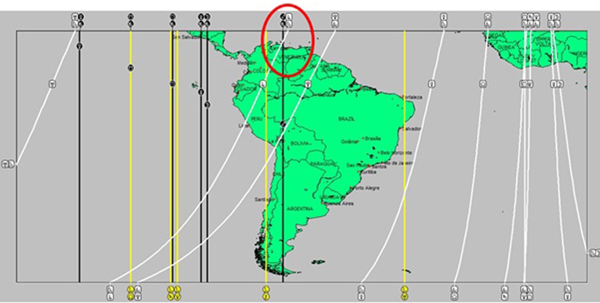 Mars/MC çakışması Güney Amerika’da Venezuela üzerinden de geçiyor. ABD-Venezuela ilişkilerinin daha da çatışmalı hal alacağını düşündürüyor. Zira Mars asker, polis, silah, çatışma ile ilişkilendirilir ve Meridyenle çakışan gezegenler de o bölgede hangi enerjinin baskın olacağını gösterir.