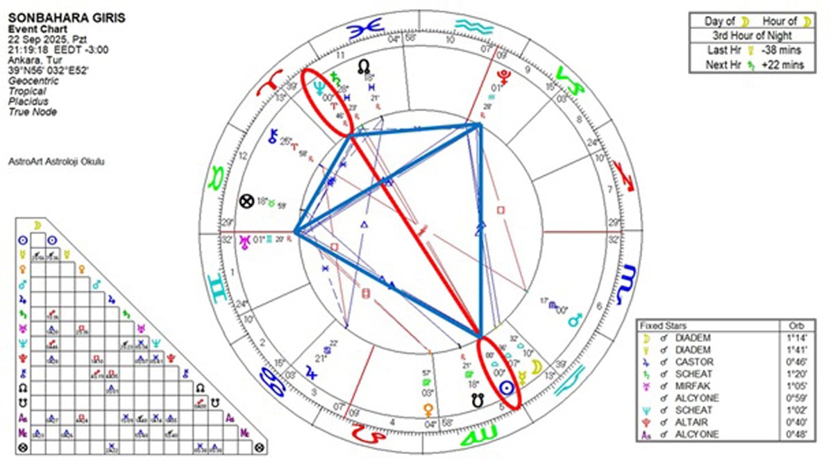Mevsim haritasında gördüğümüz bu açının kesinleşeceği 24 Eylül 2025 tarihi özellikle dikkat çeken stresli bir tarihtir. Şiddetin zirveye varacağı bir günü işaret ediyor olabilir. 7 Ekim 2023’teki saldırı esnasında Ay-Mars-Plüton arasında oluşan bir T-kare açı kalıbı vardı. 24 Eylül 2025 tarihinde de Ay’ın Mars-Plüton dik açısını tetiklediğini görüyoruz. İntikamcı, dişe diş, göze göz dediğimiz türden olaylara işaret edebilir. Bu İsrail-Filistin arasındaki şiddetin artacağını gösterebileceği gibi, Rusya-Ukrayna arasındaki şiddetin de iyice tetikleneceği bir tarihe işaret edebilir.