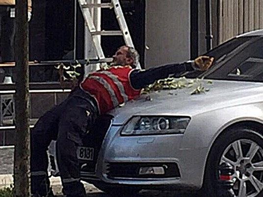 Sürücüyü bulamayan Dikmen, araç zarar görmesin diye üzerine sırt üstü yattı. O an ise fotoğraflanarak sosyal medyada, 'Vatandaşın arabasına zarar gelmesin diye göğsünü siper eden fedakar belediye işçisi Veysel Dikmen' diye paylaşıldı.