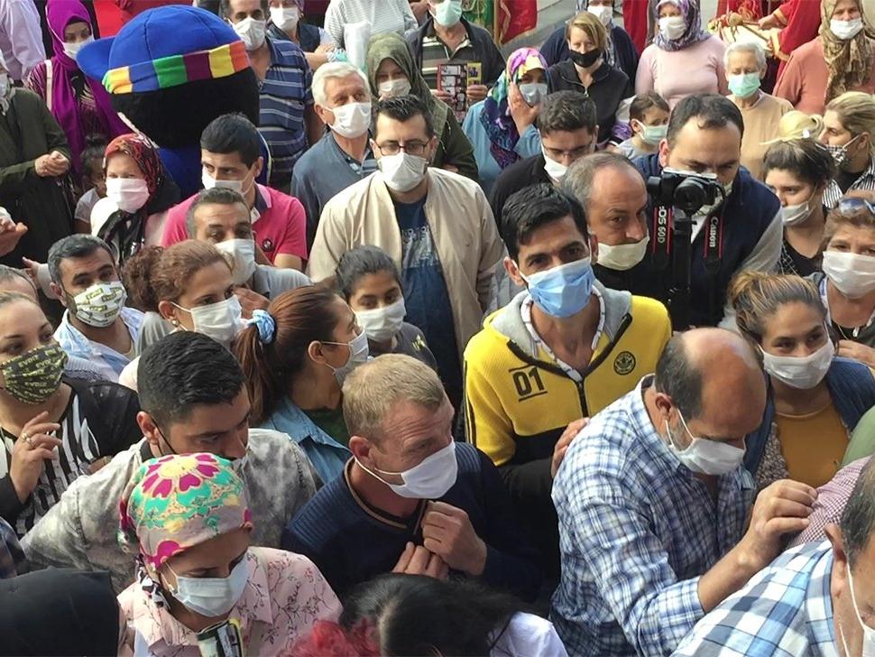 Bu sırada mağaza personeli giriş kapısında durarak maske dağıttı ve ateş ölçerek içeri kontrollü bir şekilde giriş sağlamaya çalıştı; ancak personelin tüm uyarılarına rağmen içeri girmekten ısrar eden vatandaşlar sosyal mesafe kuralını hiçe saydı. İHA