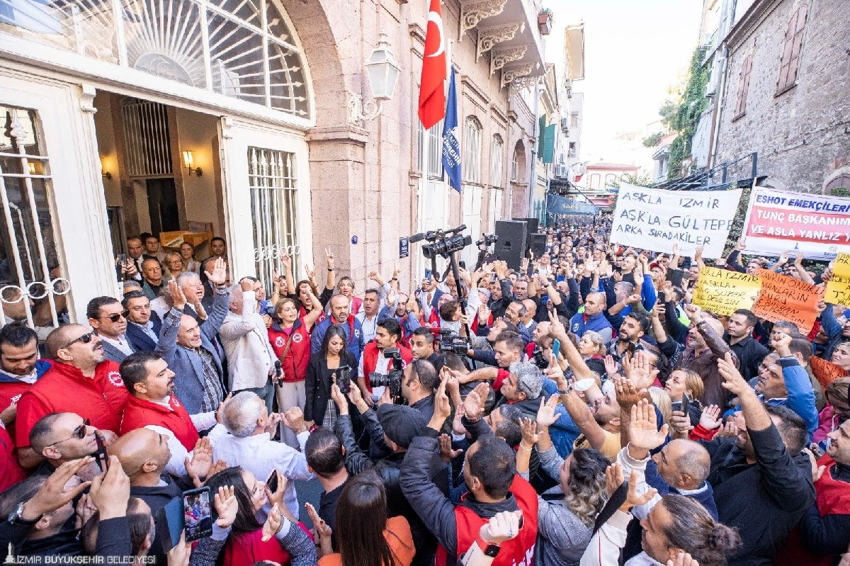 Konak’taki Tarihi Belediye Binası’nın önünde sabah 07.30’dan itibaren toplanmaya başlayan işçiler Başkan Tunç Soyer’e “Asla yalnız yürümeyeceksin” sloganlarıyla omuz verdi.