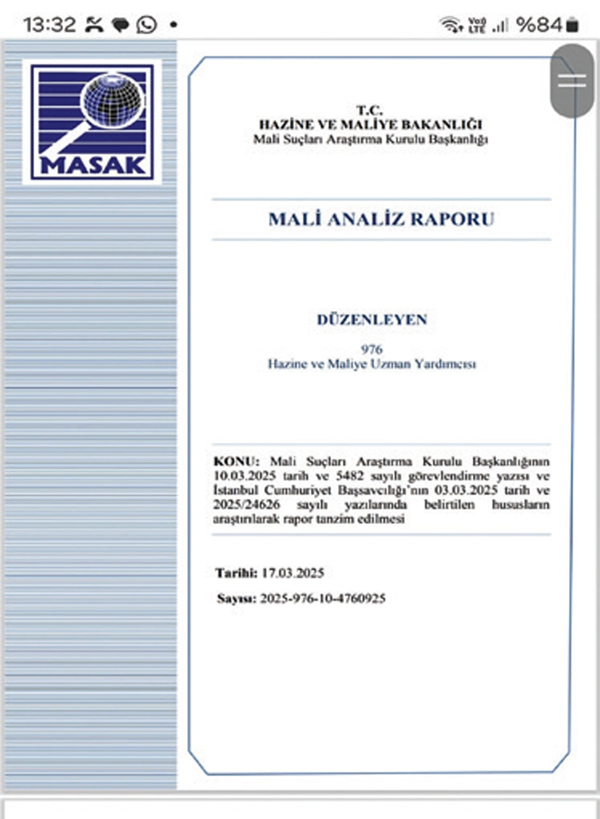 Hazine ve Maliye Uzman ve Uzman Yardımcıları MASAK bünyesinde, Suç Gelirlerinin Aklanmasının Önlenmesi Hakkındaki Kanundan gelen yetkiye dayanarak suçtan kaynaklanan bir mal varlığını ve bu mal varlığının aklandığını, ayrıca suçtan elde edilen, aklanan mal varlığının terör bağlantısı kişi veya örgütlere verilip verilmediği konusunda çalışma yaptı. Rapor, 17 Mart 2025’te Cumhuriyet Başsavcılığı’na gönderildi.