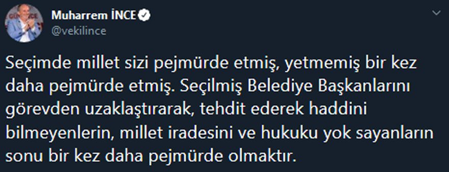 [old_news_related_template title="Kılıçdaroğlu'ndan Soylu'ya pejmürde yanıtı!" desc="CHP Genel Başkanı Kemal Kılıçdaroğlu katıldığı bir canlı yayında gündeme ilişkin önemli açıklamalarda bulundu. Kılıçdaroğlu, CHP'li belediyelere kayyum atanacağı iddiası ve İçişleri Bakanı Soylu'nun İBB Başkanı İmamoğlu için yaptığı 'pejmürde' çıkışı için, 'Her şeyi yapabilirler, çünkü ortada hukuk, adalet yok. Bu akşam ikimizi de tutuklayabilirler. Yargıtay Başkanı diyor ki, 'adalete güven yüzde 38'e indi' diyor. Cumhurbaşkanı Yardımcısı 'adalete güven kalmadı' diyor. Bunlar şu anda koltukta olan kişiler. Savcılıktan temiz kağıdı almış, YSK seçime girebilirsin diyor. Sonra bunlara kayyum atanıyor' ifadelerini kullandı." image="https://sozcuo01.sozcucdn.com/wp-content/uploads/2019/09/03/iecrop/kilicdaroglu_16_9_1567538260.jpg" link="https://www.sozcu.com.tr/2019/gundem/son-dakika-kilicdaroglu-biz-orayi-iyi-yonetemedik-5315482/"]