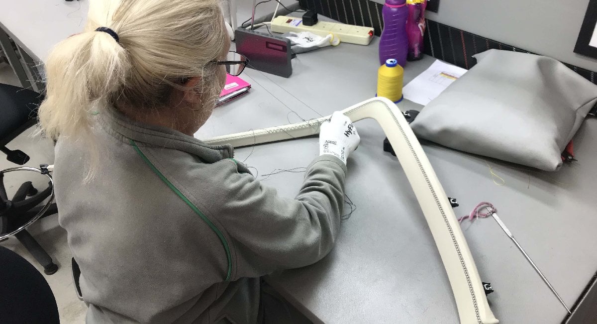 Derilerin en özel ve en çok kullanıldığı alan olan direksiyon kaplama bölümüne ahşap atölyesinden sonra vardık. Burada yapılan işlemin tamamı elle yapılıyor. Özel olarak hazırlanmış her bir ucu sivri olan çatal ile dikişlerin geçeceği yerler belirleniyor sonrasında parça deriler buralara tutturulup işlemesi yapılıyor.
