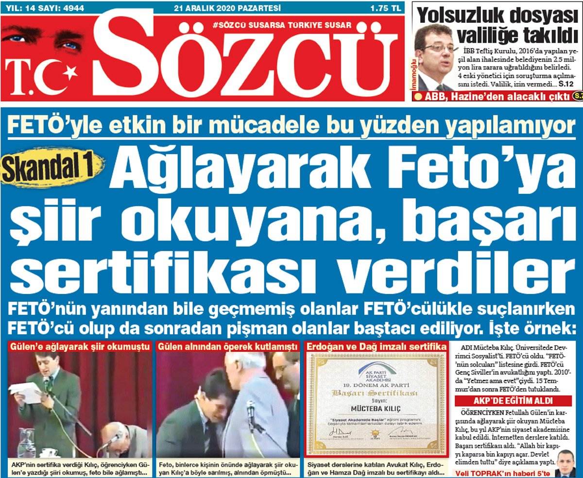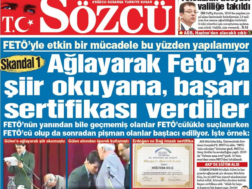AKP’nin FETÖ liderine ağlayarak şiir okuyan, 15 Temmuz’dan sonra FETÖ’den tutuklanıp itirafçı olarak cezaevinden çıkan Mücteba Kılıç’a verdiği sertifikayı SÖZCÜ önceki gün manşetine taşıdı. “Ağlayarak Feto’ya şiir okuyana, başarı sertifikası verdiler” dedi. Kılıç’ın AKP’nin siyaset okulundan sertifika alması siyaset gündeminin en çok konuşulan konularından birisi oldu. Herkes skandalı tartıştı.