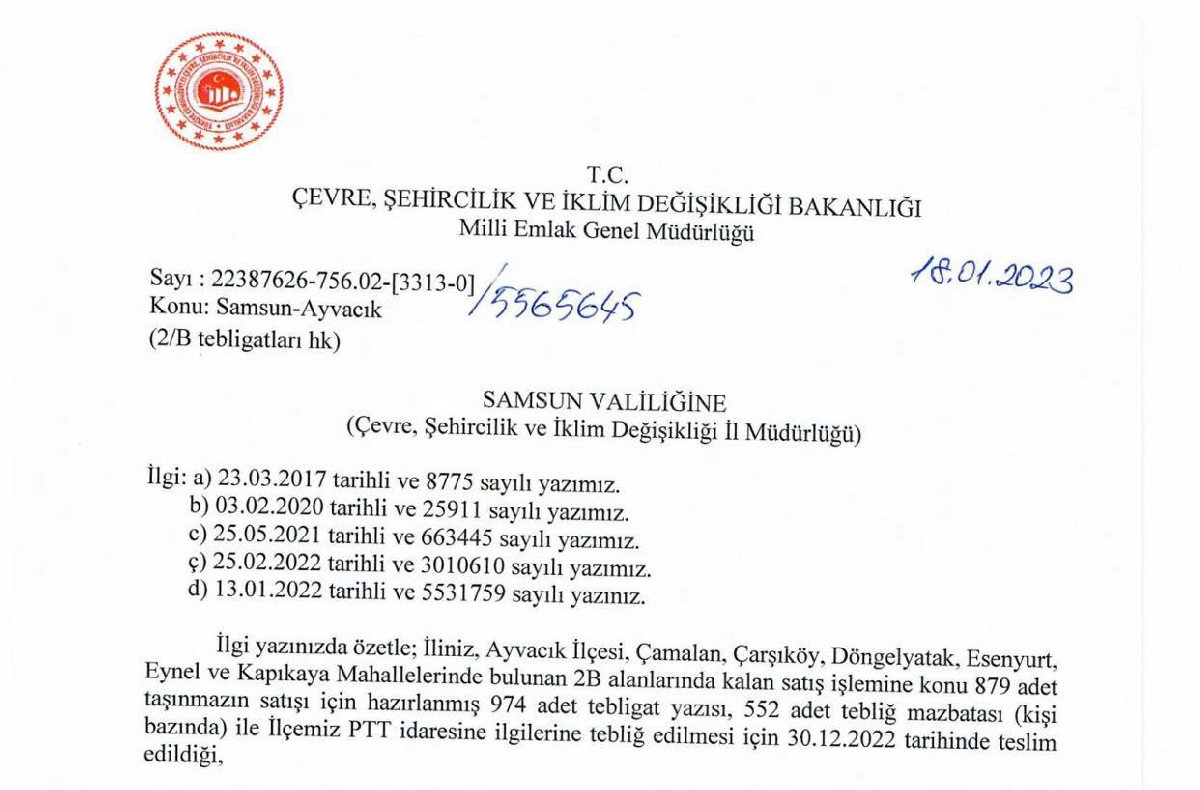Çevre, Şehircilik ve İklim Değişikliği Bakanı Murat Kurum, "Çamalan, Çarşıköy, Döngelyatak, Esenyurt, Eynel ve Kapıkaya Mahalleleri'nde bulunan söz konusu 2/B taşınmazlarının satışına ilişkin herhangi bir işlem tesis edilmemesi" yönünde Samsun Valiliği Çevre, Şehircilik ve İklim Değişikliği İl Müdürlüğü'ne yazı gönderdi.