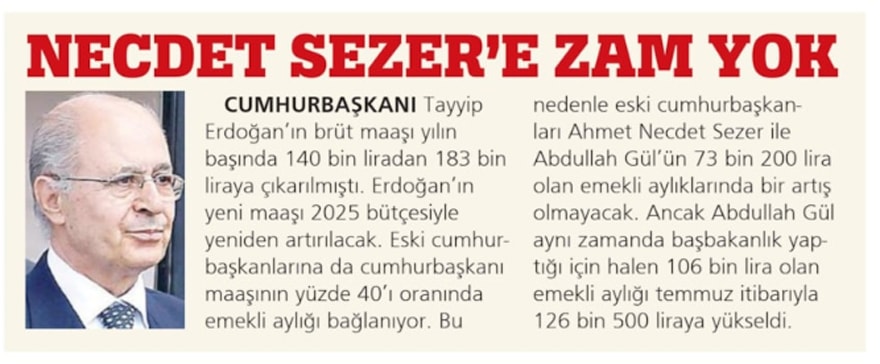 AKP’nin TBMM’ye sunduğu yasa teklifine Cumhurbaşkanı ve emeklisinin maaş hesabını değiştiren maddeler eklendi. Teklife göre Cumhurbaşkanı’nın maaşı yeni yasayla TBMM Başkanı’nın maaşının yüzde 5 fazlasına, Cumhurbaşkanı emeklisinin aylığı da TBMM Başkanı emeklisi aylığının yüzde 5 fazlasına endekslenecek. Yasanın değiştirilmesi halinde eski Cumhurbaşkanı Ahmet Necdet Sezer’in yaşadığı maaş skandalı sona erecek. Çünkü emekli Cumhurbaşkanları, Cumhurbaşkanı maaşının yüzde 40’ını alabiliyor. Sezer’in 2025 yılı maaşı 99 bin 218 lirada kalmış ve kamudaki daire başkanının maaşının bile altına düşmüştü. Düzenlemeyle Sezer’in emekli aylığı 48 bin 250 lira artarak 148 bin 467 liraya çıkacak. Cumhurbaşkanı Tayyip Erdoğan’ın brüt 238 bin lira olan maaşı da net 200 bin lira civarında olacak. Erdoğan’ın mevcut ödeneği brüt olduğu için net ele geçen maaşta büyük fark olmayacak.