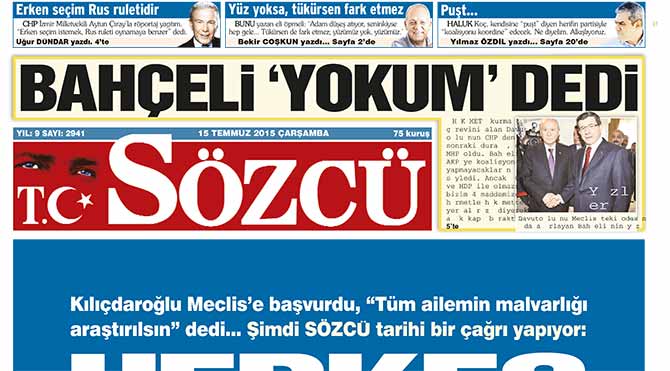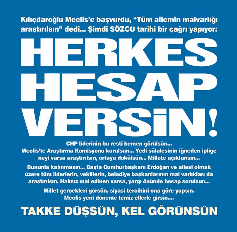 CHP Genel Başkanı Kemal Kılıçdaroğlu’nun “tüm ailesinin mal varlığının araştırılması” için TBMM’ye başvurması, SÖZCÜ’nün milletvekili ve belediye başkanlarının TBMM’de kurulacak komisyona hesap vermesini istemesi büyük yankı buldu. Cumhurbaşkanı Recep Tayyip Erdoğan’ın, başbakanlığı dönemiyle ilgili suçlamalar varsa bu konularda soruşturmalar açılabileceği, yargılama yapılabileceği bildirildi.