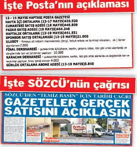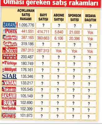 Biz tespit ettikEğer açıklamazlarsa, biz açıklayacağız. Çünkü Türkiye’nin değişik yerlerindeki satış noktalarında tek tek inceleme yaptık. Hangi gazetenin ne kadar bayi satışı olduğunu ortalama olarak belirledik. Bizim bulduğumuz rakamlarla, gazetelerin sattıklarını ileri sürdükleri rakamlar arasında uçurum var. Çağrımızı tekrarlıyoruz. Gelin gerçek bayi, abone, sponsorlu satışlarınız ile bedava dağıtımlarınızı açıklayın. Gelin tiraj denetimi yapalım. Bağımsız bir kuruluş, tıpkı Avrupa’da olduğu gibi gazetelerin satış rakamlarını incelesin.
