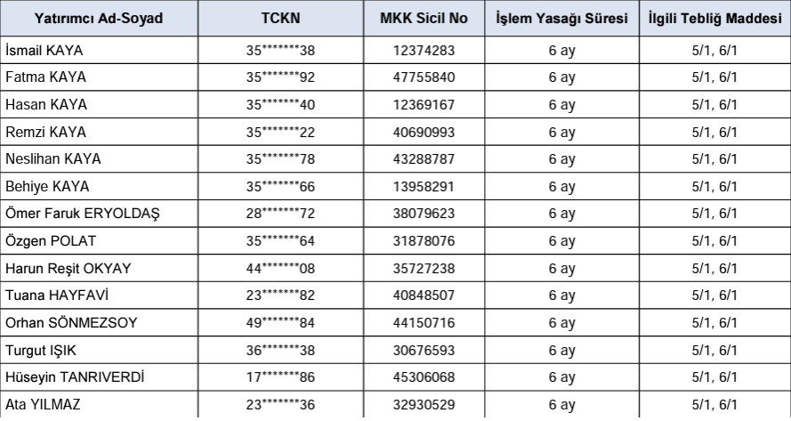 Kurul, yatırımcıların hak ve yararlarının korunmasını teminen, yapay piyasa oluşturmaya yönelik işlemlerin engellenmesi amacıyla söz konusu isimlere 7 Ağustos itibarıyla borsalarda 6 ay süreyle geçici işlem yasağı uygulanmasını kararlaştırdı.