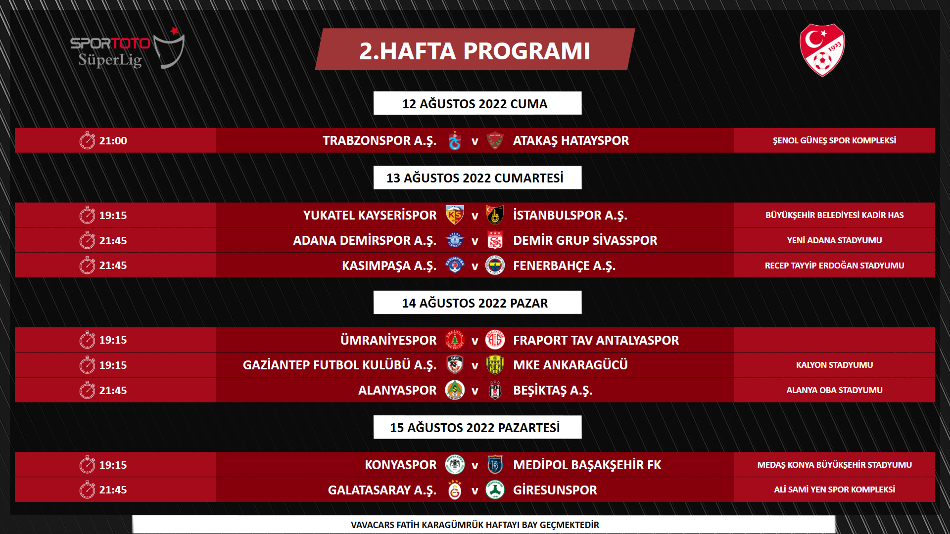 - 2 Ağustos'ta yapılacak olan UEFA Şampiyonlar Ligi Play Off Turu kura çekimi sonrası belirlenecek olan tarihlere göre, Şampiyonlar Liginde oynayacak takımlarımızın 2. hafta maç programında değişiklik yapılabilecektir.
