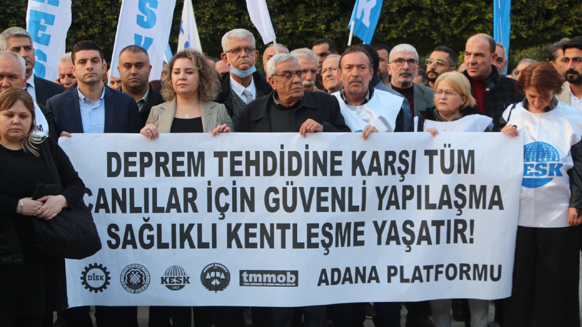 Adana Atatürk Parkı'nda bir araya gelen aralarında KESK, DİSK, Adana Barosu, TMMOB ve Adana Tabip Odası'nın da aralarında olduğu sivil toplum kuruluşlarının temsilcileri, ortak açıklama yaptı. Grup adına açıklamayı okuyan Adana Tabip Odası Başkanı Ahmet Suntur, "Yaşanan bu depremlerle, depreme hazırlıksız olduğumuz bir kez daha gün yüzüne çıkmıştır. Defalarca söylediğimiz gibi doğa olayı olan depremi afete çeviren dayanıksız yapılardır. TBMMnin İzmir depremi sonrası kurduğu Araştırma Komisyonunun Temmuz 2021 tarihli raporuna göre, Türkiyede 10 milyon civarında olan yapı stokunun 6-7 milyon civarındaki kısmı riskli yapı statüsündedir. Bu risk ortadan kaldırılmadığı veya azaltılmadığı sürece ülkemiz, büyük yıkımlarla defalarca yüzleşebileceği gibi, depremler sonrası müdahalelerde de yetersiz kalmaya mahkum olacaktır" dedi.