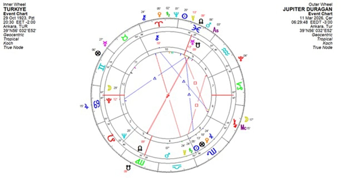 Ülkemiz astroloji haritasının aldığı transitlere baktığımızda, 9 Mart civarında halkın sağlığı açısından dikkatli olunması gereken bir zaman diliminde olacağız. 9-11 Mart aralığındaki dönemde alınan geleceğe yönelik bazı kararlara halktan insanlar veya muhalefet partiler tarafından karşı duruş sergilenebilir. 15 Mart civarındaki günlerde yakın ve komşu devletlerle ilişkilerde agresif gelişmeler devreye girebilir. Uzak komşularla ilgili alan hayli gergin etkiler alıyor olacak. 18-19 Mart civarı borsa açısından pozitif yönde destekleyici bazı gelişmeleri beraberinde getirebilir.