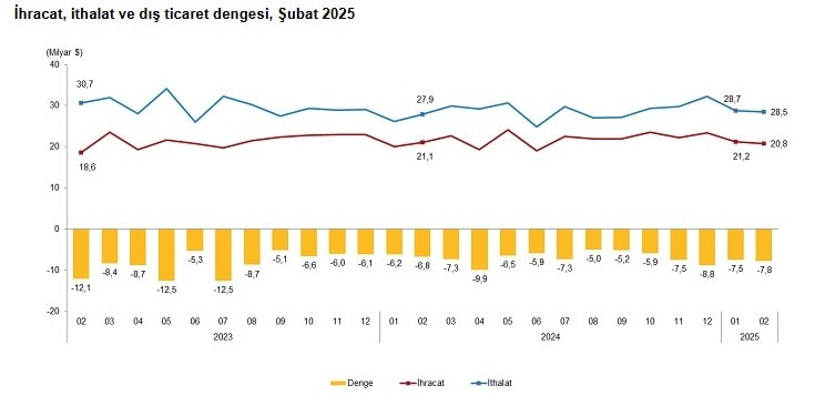 Türkiye İstatistik Kurumu ile Ticaret Bakanlığı iş birliğiyle genel ticaret sistemi kapsamında üretilen geçici dış ticaret verilerine göre; ihracat 2025 yılı Şubat ayında, bir önceki yılın aynı ayına göre yüzde 1,6 azalarak 20 milyar 761 milyon dolar, ithalat yüzde 2,4 artarak 28 milyar 533 milyon dolar olarak gerçekleşti.