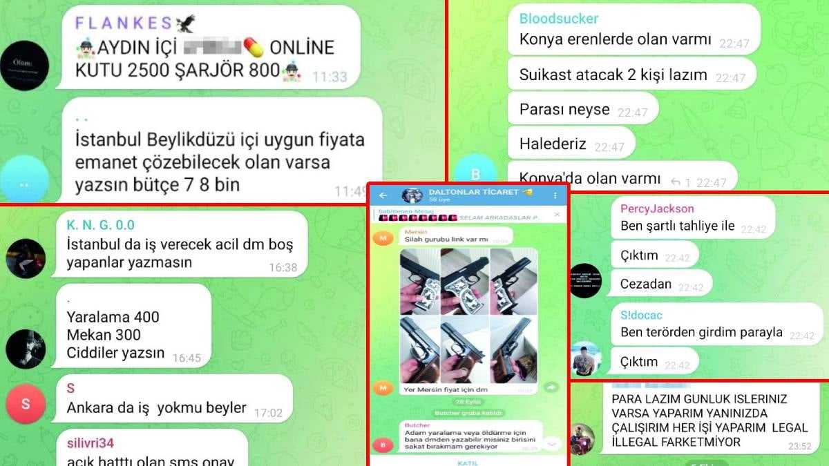 “İstanbul içi acil tetikçi aranıyor” veya “Ev, dükkan fark etmez; ekipli kurşunlama yapılır, ödeme yarısı önce yarısı sonra alınır” gibi mesajlar, suçun ulaştığı cüretkarlığı gözler önüne seriyor. İlanlarda, “Ankara içi kuryelik”ten “İstanbul içi darp, kundaklama, kurşunlama”ya kadar çeşitli suç hizmetleri yer alıyor. Bazı gruplarda ise “Bulgar’a geçiş 3000 euro” gibi insan kaçakçılığı teklifleri bulunuyor.