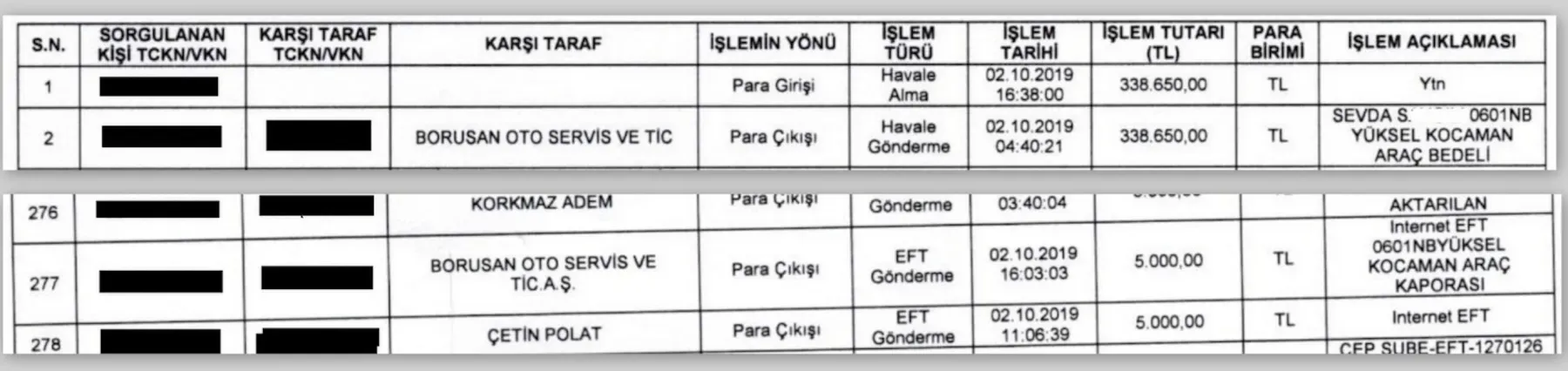 Mali Suçları Araştırma Kurulu (MASAK) tarafından yapılan incelemede, Kaplan'ın asistanı Sevda S. tarafından 2 Ekim 2019 tarihinde “Yüksel Kocaman araç kaporası” ve “Yüksel Kocaman araç bedeli” adı altında Borusan Oto’ya 5 bin ve 338 bin 650 lira ödeme yapıldığı belgelendi.