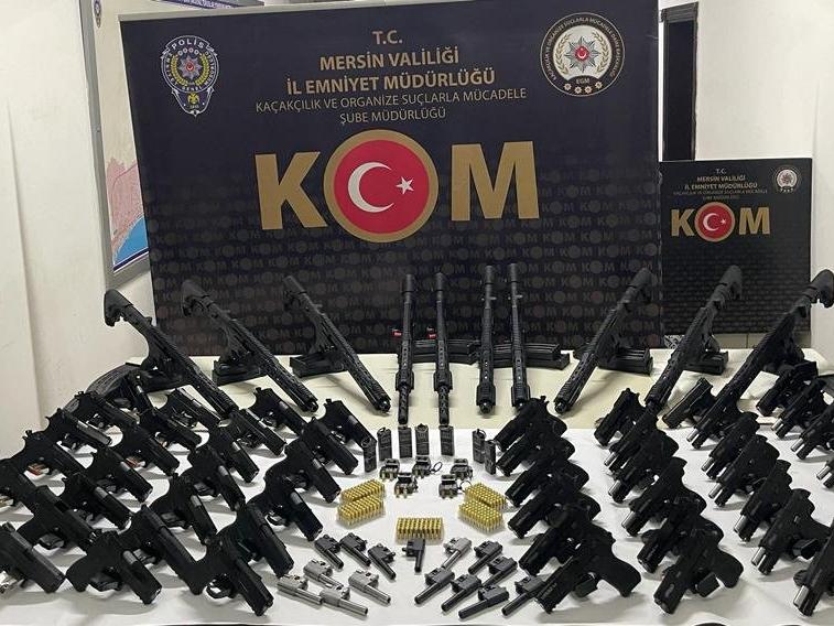 Mersin'de polisin kuşku üzerine durdurarak arama yaptığı otomobilde ele geçirdiği 6 tabancadan sonra belirlenen adrese düzenlenen operasyonda adeta cephanelik ortaya çıkartıldı. 3 kişinin gözaltına alındığı operasyonda 53 adet ruhsatsız tabanca, 12 adet suikast silahı, 10 adet otomatik tüfek, 20 adet şarjör, 26 adet namlu ve 250 adet 9 mm fişek ele geçirildi.