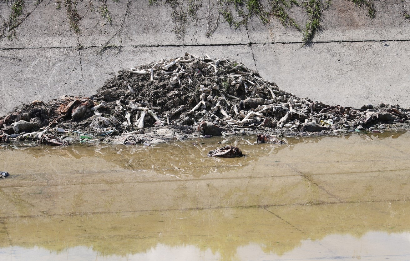 Adana'da önceki gün merkez Yüreğir ilçesi Alihocalı Mahallesi'ndeki sulama kanalında, su çekildikten sonra hayvan kemikleri ve et kalıntıları ortaya çıktı. Çevreye yayılan kokudan rahatsız olan vatandaşlar, durumu yetkililere bildirdi. Bölgeye gelen yetkililerin incelemesinin ardından kalıntıların at ve eşeklere ait olduğu anlaşıldı. Ekipler, sulama kanalındaki et kalıntılarını temizleyip, inceleme başlattı.