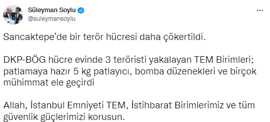 “Sancaktepe’de bir terör hücresi daha çökertildi.” ifadesini kullanan Bakan Süleyman Soylu şu ifadeleri kullandı: