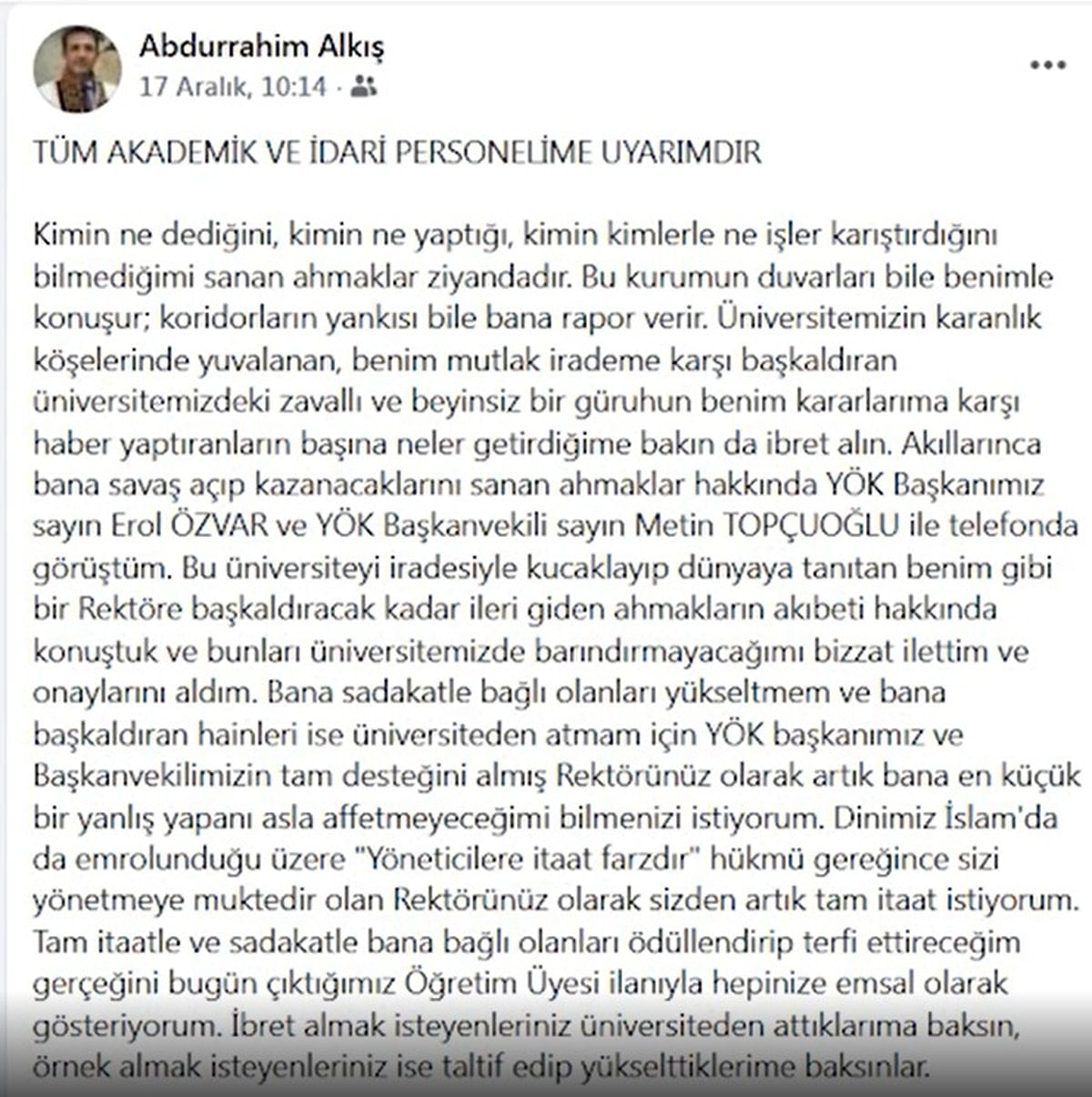 -Rektör Abdurrahim Alkış, 17 Aralık tarihli Facebook mesajında akademik ve idari persolene gözdağı verdi, kişiye özel kadrolarla “kendisine itaat edenleri” atayacağını, kendisine muhalif gördüğü personeli tehdit ederek ilan etti.