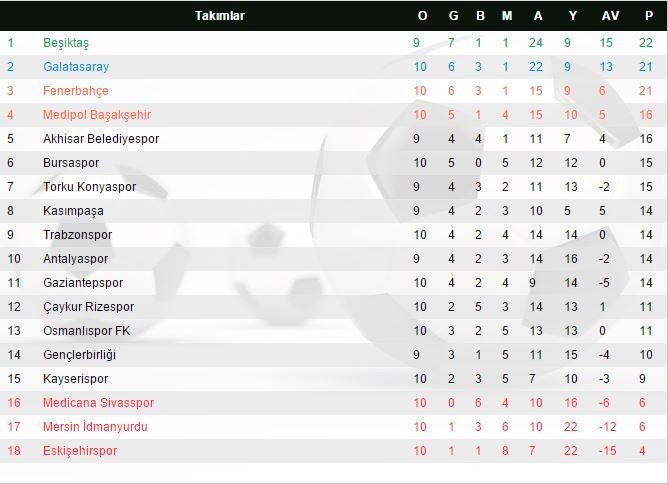 Süper Lig Hasan Doğan Sezonu'nun 10. hafta maçları bugün oynanacak 3 maç ile tamamlanacak. Süper Lig'de dün oynanan son maçta Galatasaray, konuk ettiği Eskişehirspor'u 4-0 mağlup etti. Günün saat 19.00'da başlayan iki karşılaşmasında Osmanlıspor FK, konuk ettiği Fenerbahçe'ye 1 - 0 mağlup olurken, Mersin İdmanyurdu ile Medipol Başakşehir ise karşılıklı atılan gollerle 1 – 1 berabere kalarak 1'er puana razı oldular.